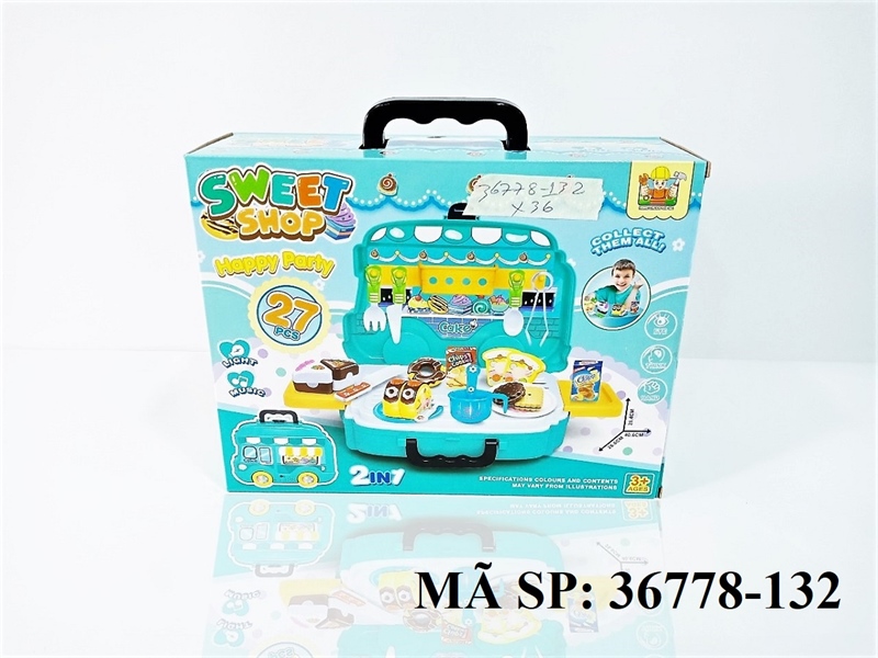 36778-132 HỘP VALI XE BẾP BÁNH QUY, BÁNH KEM 27 MIẾNG 2IN 1, PIN NÚT (Sweet Shop Happy Party)